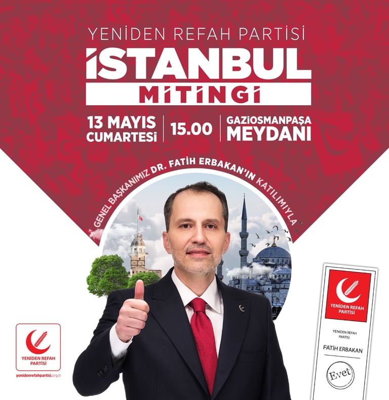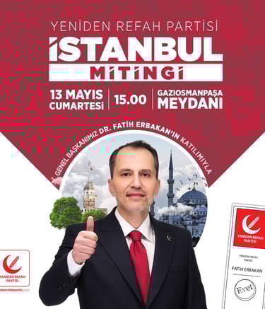Genel Başkanımız Dr. Fatih Erbakan, 13 Mayıs Cumartesi günü İstanbul mitinginde halkımızla buluşacaktır. Tüm milletimiz davetlidir.