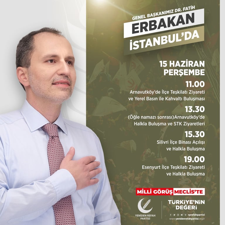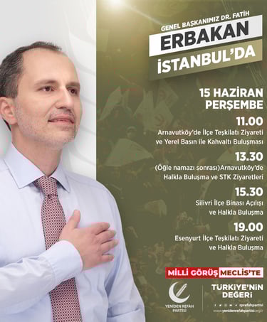 Genel Başkanımız Dr. Fatih Erbakan, 15 Haziran Perşembe günü (yarın) Arnavutköy, Silivri ve Esenyurt'da teşekkür ziyaretleri çerçevesinde bir dizi etkinliğe katılacaktır.