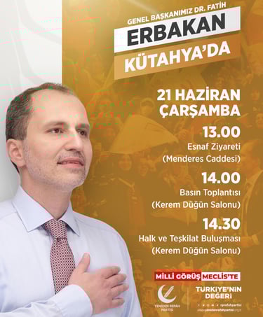 Genel Başkanımız Dr. Fatih Erbakan, 21 Haziran Çarşamba günü (yarın) Kütahya'da teşekkür ziyaretleri çerçevesinde bir dizi etkinliğe katılacaktır.