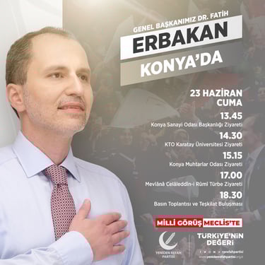Genel Başkanımız Dr. Fatih Erbakan, 23 Haziran Cuma günü (yarın) Konya'da teşekkür ziyaretleri çerçevesinde bir dizi etkinliğe katılacaktır.