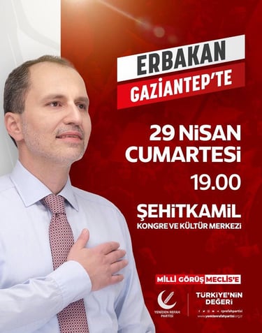 Genel Başkanımız Dr. Fatih Erbakan 29 Nisan Cumartesi günü Gaziantep’te milletimizle buluşuyor. Tüm halkımız davetlidir.