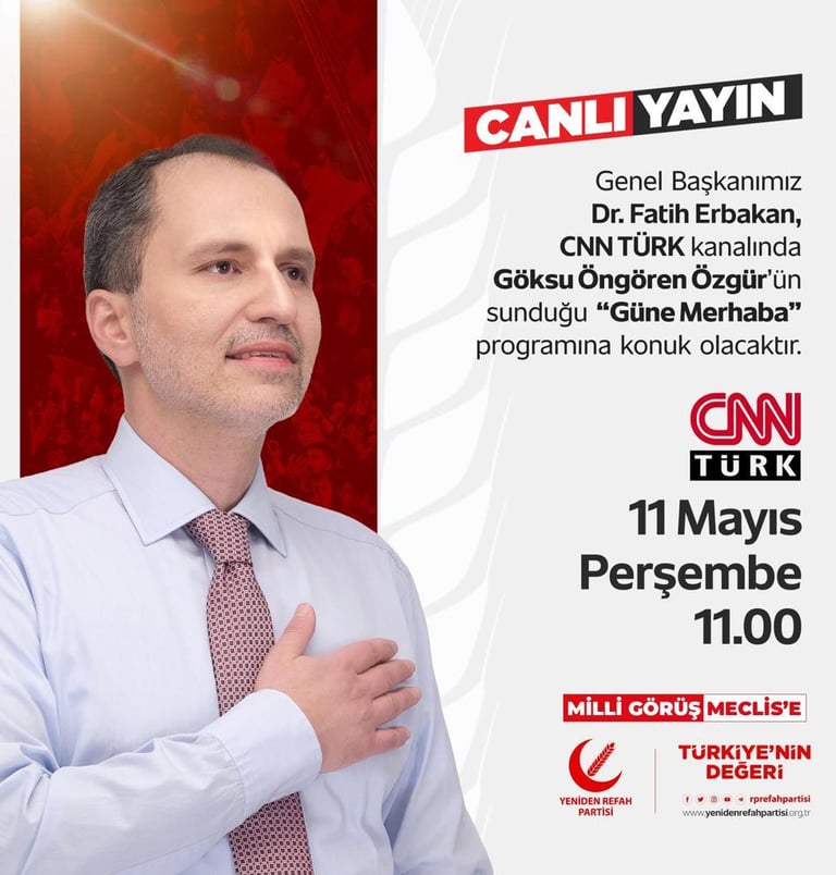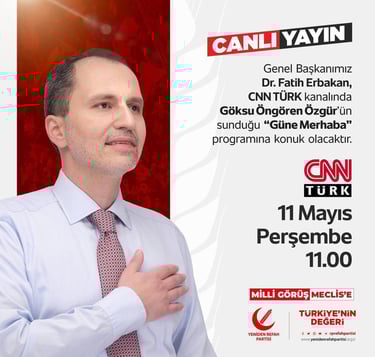 Genel Başkanımız Dr. Fatih Erbakan, CNN TÜRK kanalında Göksu Öngören Özgür’ün sunduğu “Güne Merhaba” programına konuk olacaktır.